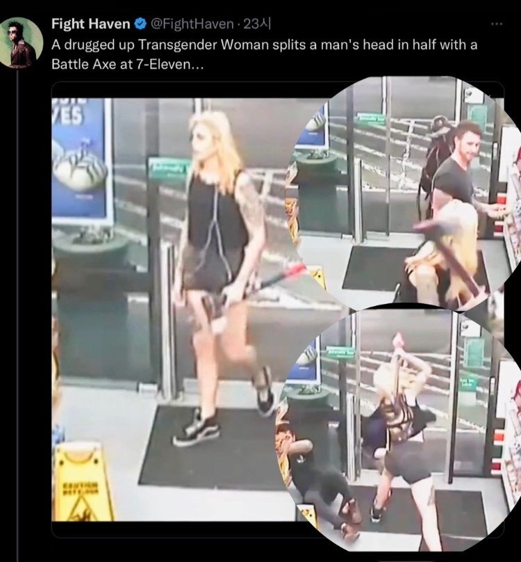 A drugged up Transgender Woman splits a man's head in half with a Battle Axe at 7-Eleven... pic.twitter.com/eqGMv5SPGw