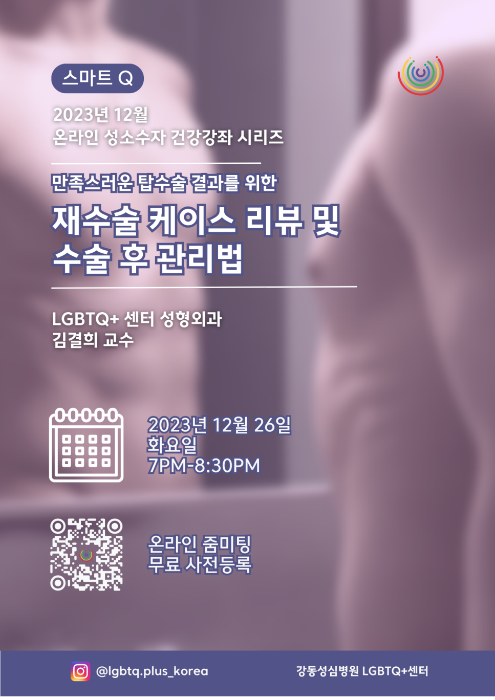 강동성심병원 LGBTQ+센터에서는 매월 마지막 주 월요일에 온라인 성소수자 건강강좌 [스마트Q]를 진행하고 있습니다.
