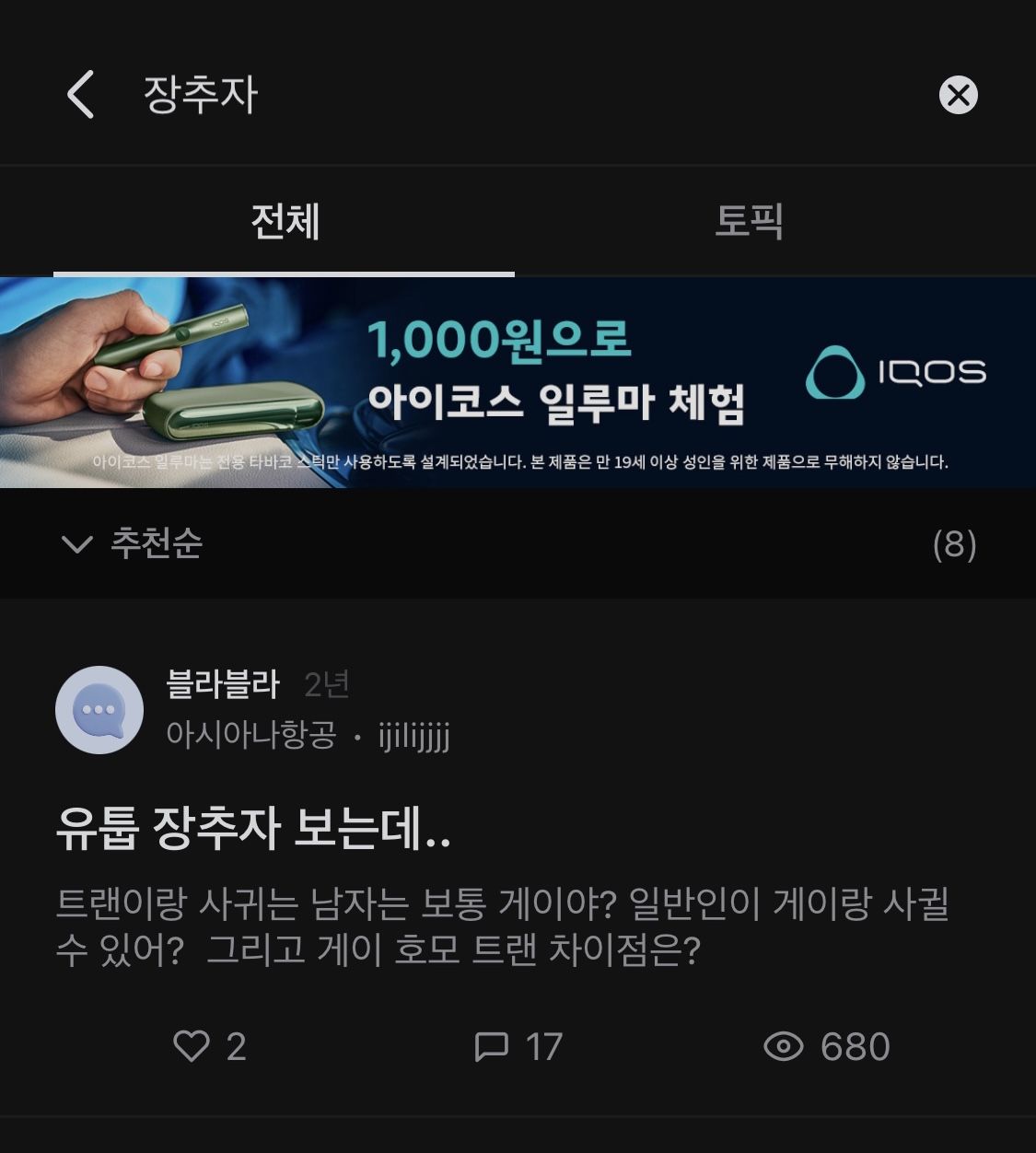 나도 커뮤니티 여러개 하는데 남초에선 트젠방송 언급도 없고 여초는 니 새끼가 가입을 못했을거 아냐ㅡㅡ 지가 무슨 직장인 대표인양 블라인드 어쩌고 씹쑈 잘하던데 블라인드에 장추자 검색하면 가장 최신글이 2년전 글인데? 어디 뭐 맘카페라도 활동하는거니?