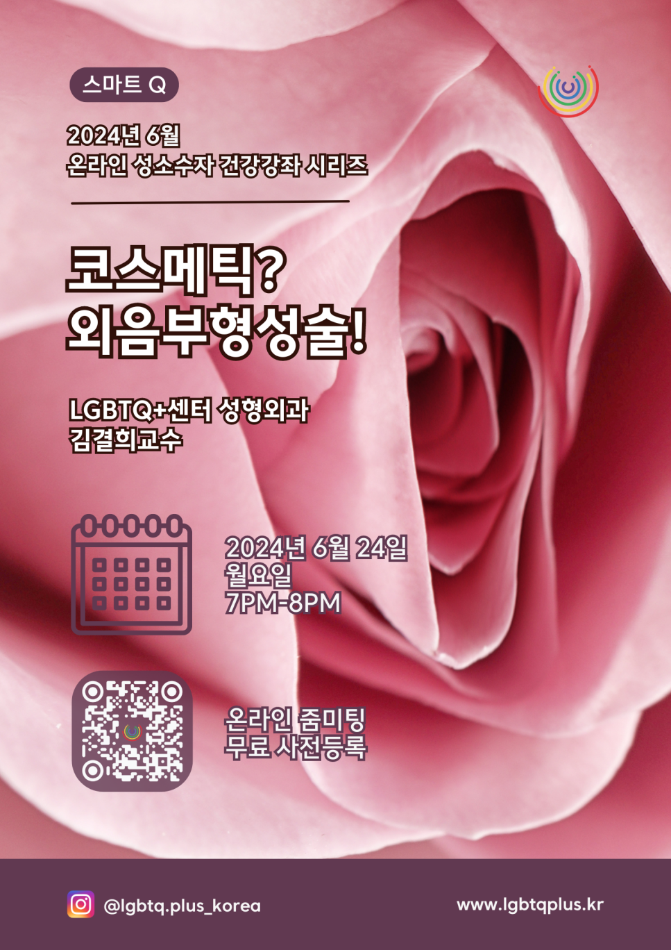 24.06월에는 강동성심병원 LGBTQ+센터 김결희 교수님의 ‘코스메틱? 외음부형성술!' 에 대한 강의가 진행될 예정입니다.