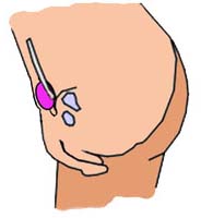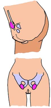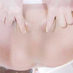 피부용의 접착제(의료용이나 연극의 특수 메이크용)로 자신의 음낭을 접착시켜 페니스의 밑을 숨겨 버립니다. 이것으로 균열이 완성됩니다.