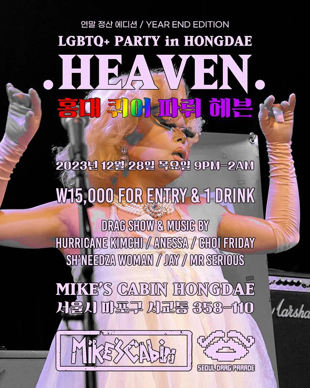 Let's say goodbye to 2023 by partying together at Hongdae LGBTQ+ night 'HEAVEN' (year end edition)! Come and enjoy fantastic drag performances and great music played by amazing DJs at Mike's Cabin Hongdae!