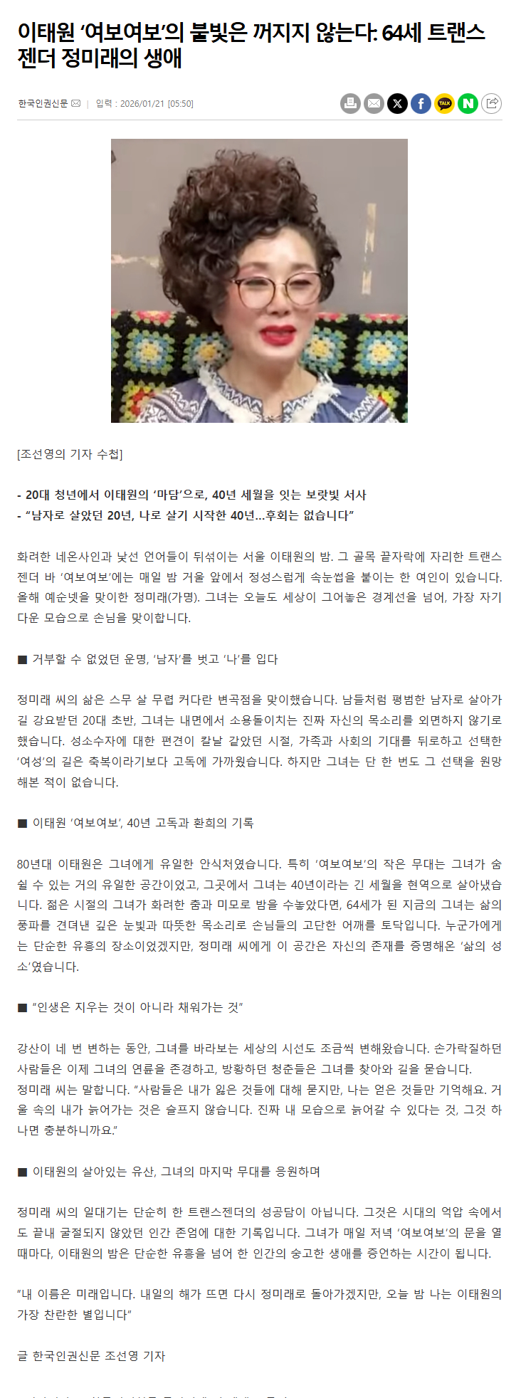 정미래 씨의 일대기는 단순히 한 트랜스젠더의 성공담이 아닙니다. 그것은 시대의 억압 속에서도 끝내 굴절되지 않았던 인간 존엄에 대한 기록입니다. 그녀가 매일 저녁 ‘여보여보’의 문을 열 때마다, 이태원의 밤은 단순한 유흥을 넘어 한 인간의 숭고한 생애를 증언하는 시간이 됩니다.