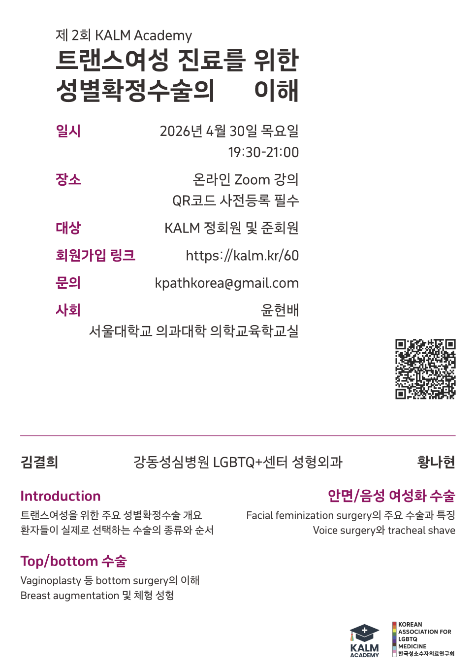 [강동성심병원 LGBTQ+센터] 이번 달은 한국성소수자의료연구회 강의로 진행합니다! KALM Academy 26년 4월 강의 …