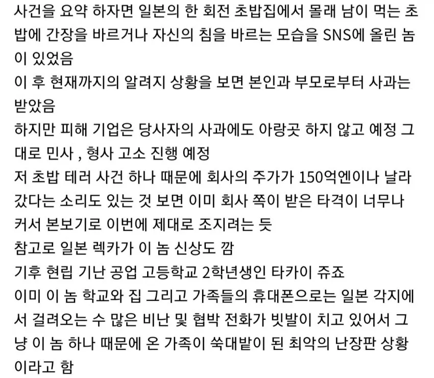 얼마 전 있었던 일본 초밥 가게 테러범 결말