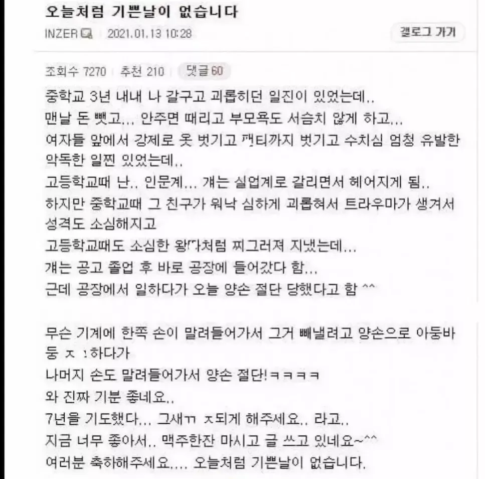 자신을 괴롭히던 일진 소식을 들은 사람