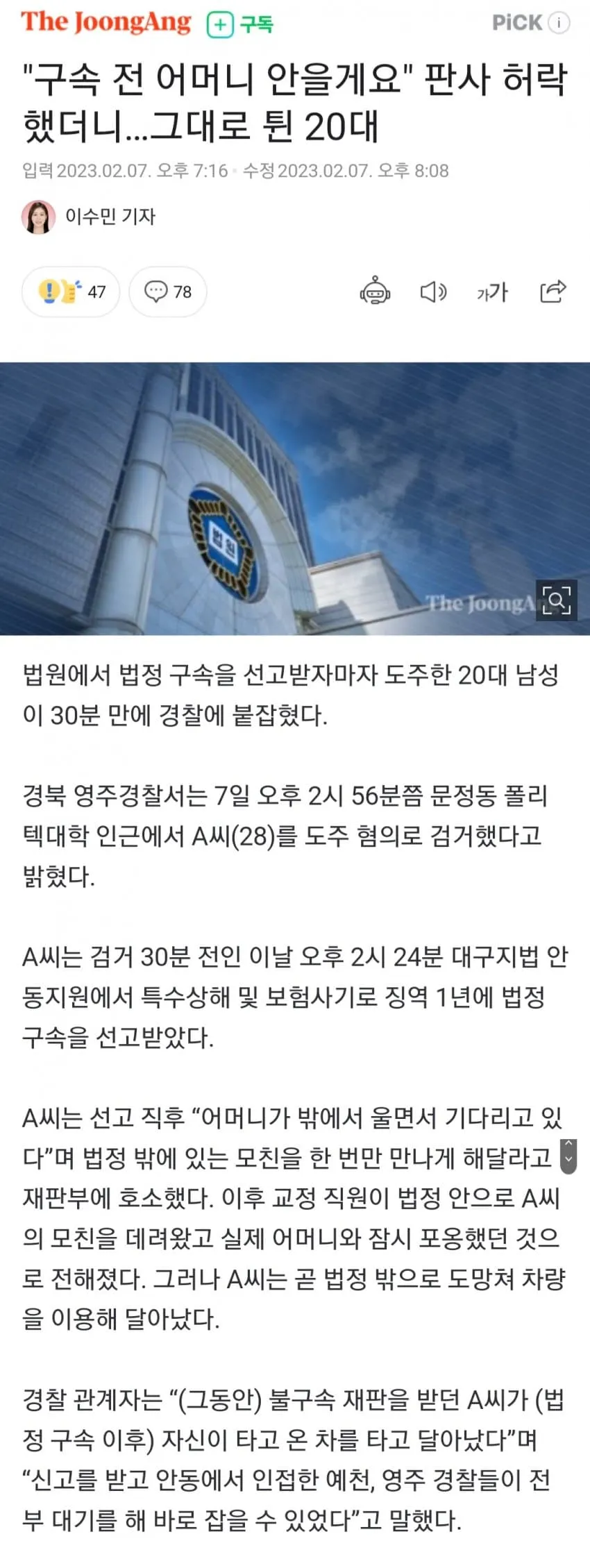 구속 전 어머니 안을게요" 판사 허락했더니 달아난 20대