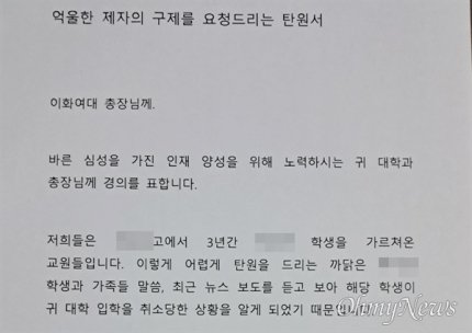 "이화여대 직원의 잘못된 추가 합격생 등록일 안내로 합격이 취소됐다"고 억울함을 호소하고 있는 고3 제자를 위해 모교 교원들이 자신의 이름과 서명을 적은 탄원서를 제출했다. 합격 취소된 제자를 위해 현직 교원들이 집단으로 탄원서를 작성한 것은 이례적인 일이다.