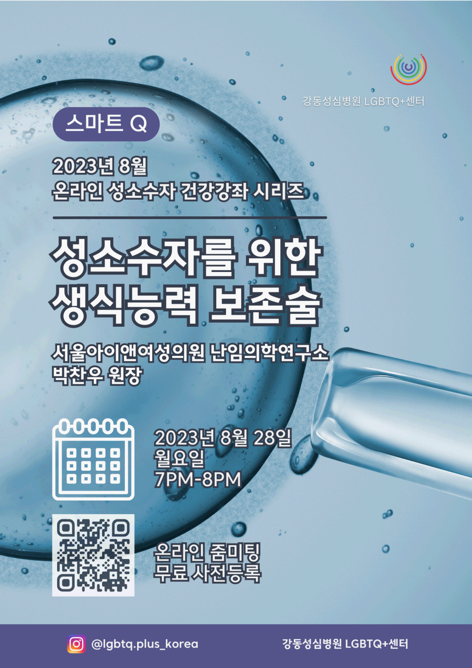 강동성심병원 LGBTQ+센터에서는 매월 마지막 주 월요일에 온라인 성소수자 건강강좌 [스마트Q]를 진행하고 있습니다.