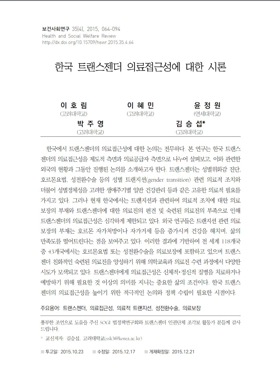 [기타] 한국 트랜스젠더 의료접근성에 대한 시론 - 김승섭, 고려대학교