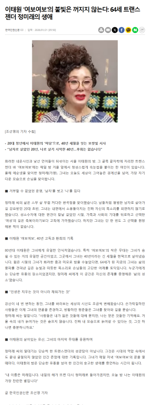 [조선영의 기자 수첩] - 20대 청년에서 이태원의 ‘마담’으로, 40년 세월을 잇는 보랏빛 서사 - “남자로 살았던 20년, 나로 살기 시작한 40년…후회는 없습니다” 화려한 네온사인과 낯선 언어들이 뒤섞이는 서울 이태원의 밤. 그 골목 끝자락에 자리한 트랜스젠더 바 ‘여보여보’에는 매일 밤 거울 앞에서 정성스럽게 속눈썹을 붙이는 한 여인이 있습니다. 올해 예순넷을 맞이한 정미래(가명). 그녀는 오늘도 세상이 그어놓은 경계선을 …
